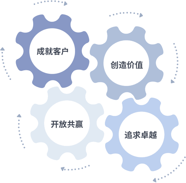 成就客户是一切决策的出发点,,,创造价值是衡量所有工作的标准,,,,追求卓越是我们做事做人的态度,,开放共赢是我们的格局也是最终的结果。。价值观的齿轮环环相扣,,,推动着组织里的每个人不断向前。。。。